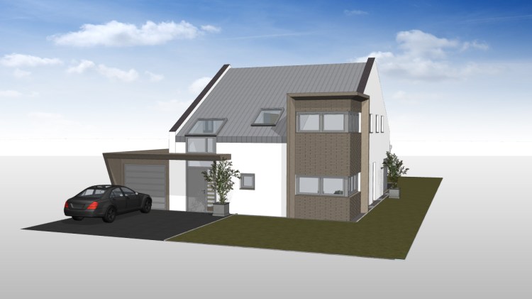 Das freistehende Einfamilienhaus mit über 190 m² Wohnfläche steht inmitten der gewachsenen Dorfstruktur. Die klare Formensprache dominiert auch hier das äußere und innere Erscheinungsbild. Die große Garage wird durch das gemeinsame Vordach in das Haus integriert. Die große Eckgaube straßenseitig, wie auch die hervorspringende Gaube im Gartenbereich werden durch umlaufende, verjüngte Lisenen akzentuiert und geben dem Gebäude einen unverwechselbaren Charakter. Einmal mehr wird die Farbgestaltung mit Trespa-Platten unterstrichen.