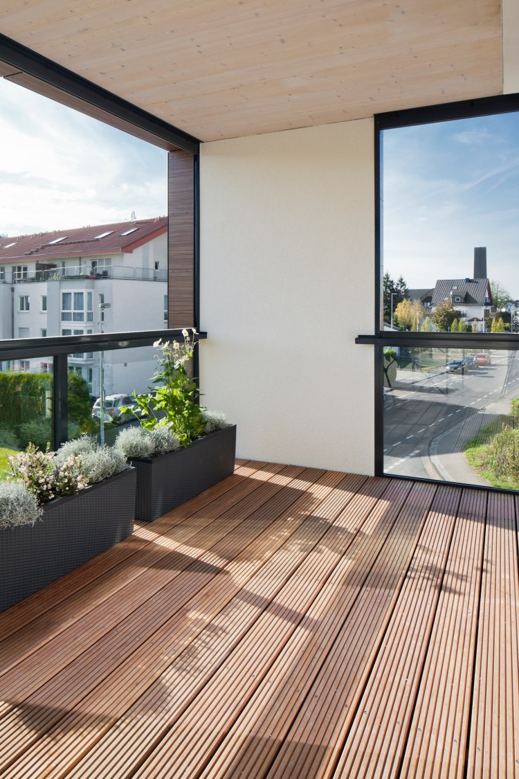 Ein geschlossener Wohnblock zur Bonner Straße schottet den großzügigen Innenhof gegen die Lärmemissionen ab. Zur Verbesserung des Schallschutzes an der Bonner Straße, wurden den Wohnräumen Wintergärten vorgehangen. Die großflächige Verglasung kann seitlich weggeschoben werden, so dass der Charakter einer Loggia entsteht.