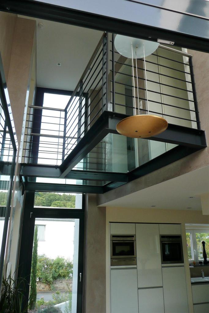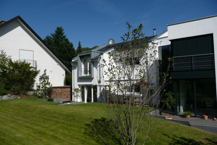 Das Bestandsobjekt aus den 60er Jahren verlangte eine eingehende energetische Sanierung. Da die bestehende Wohnfläche nicht für die Bedürfnisse der Bauherren ausreichte, wurde das Gebäude mit einem Anbau vergrößert. Dieser Anbau sollte sich in Form und Gestaltung von Altbau klar absetzen. Daher wurde der Neubau über eine ‚Glasfuge‘ an den Bestand angedockt. Der Anbau wurde im Grundriss verdreht. In dem entstandenen Luftraum wurde im OG eine transparente Glas-/Stahl-Brücke als Verbindungselement eingefügt.